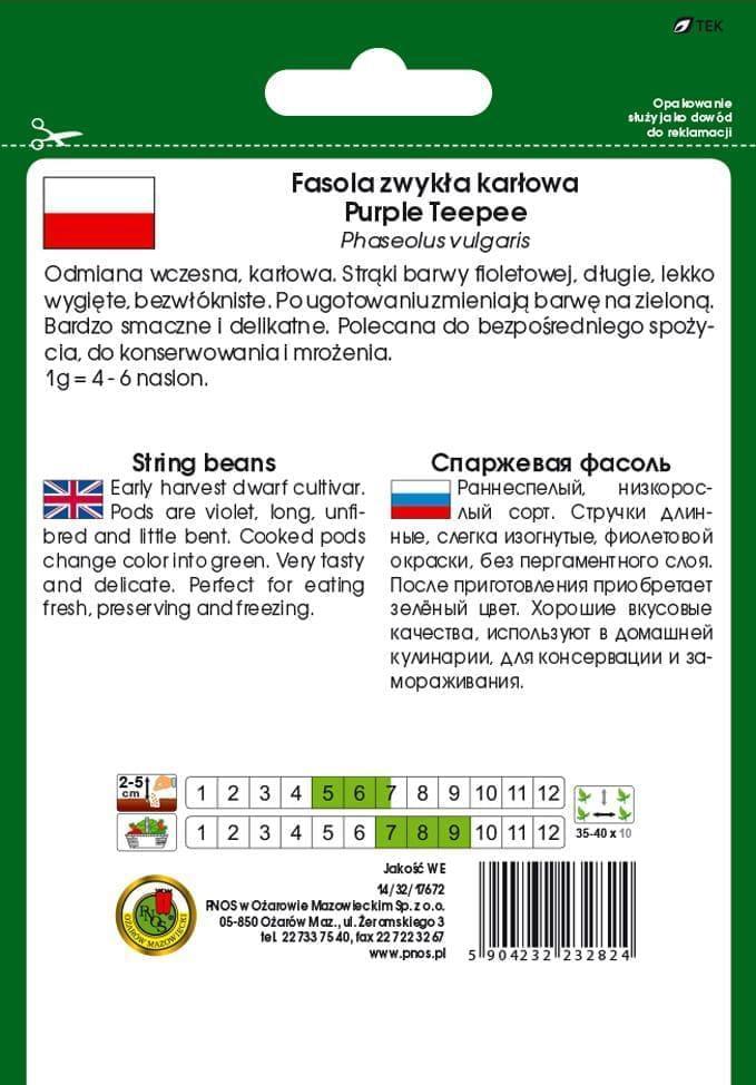 Fasola Szparagowa Purple Teepee to wczesna, karłowa odmiana, charakteryzująca się długimi, fioletowymi strąkami, które po ugotowaniu zmieniają kolor na zielony. Strąki są bezwłókniste, delikatne i wyjątkowo smaczne, dzięki czemu doskonale sprawdzą się w kuchni.