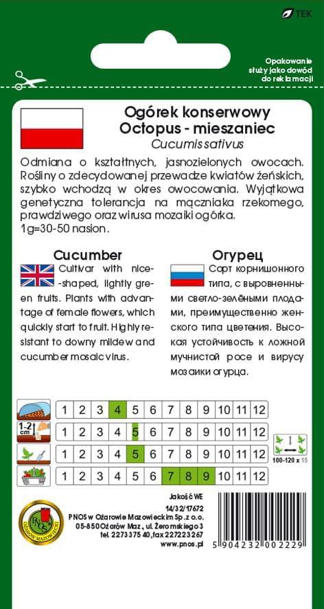 Ogórek 'Octopus' F1 to średnio wczesna, grubo brodawkowa odmiana o bardzo silnym wzroście, zapewniająca wysoki plon i doskonałą jakość owoców. Owoce są cylindryczne, proporcja długości do szerokości wynosi 3:1, a ich jasne smugi i rozjaśniony koniec nadają im atrakcyjny wygląd. Odmiana charakteryzuje się równomiernym plonowaniem i wysokim udziałem plonu handlowego.