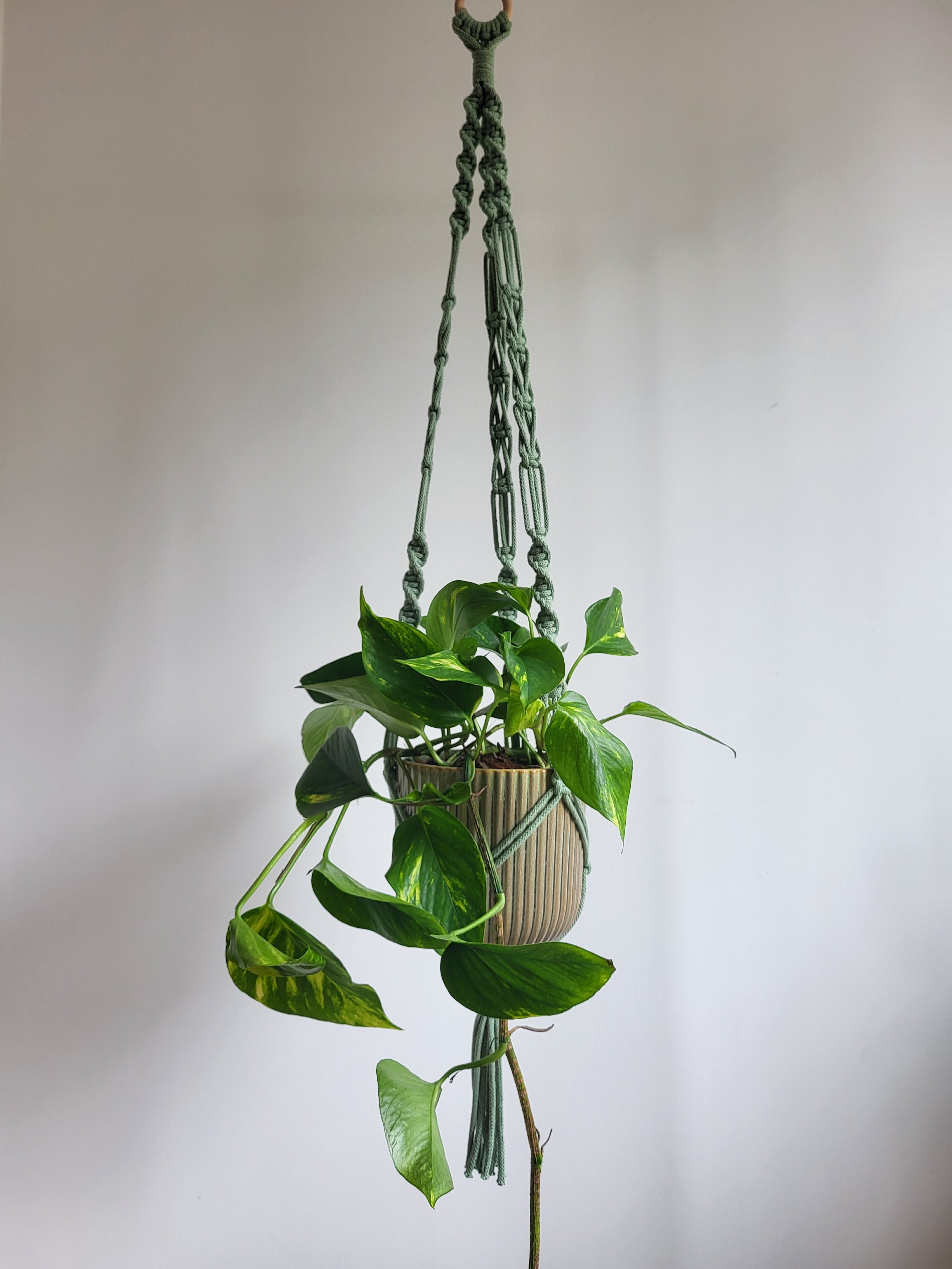 📏 Doskonałe Proporcje: Z dumą prezentujemy Wam kwietnik o długości 112 cm (mierzone bez doniczki), wykonany z wysokiej jakości sznurka bawełnianego (5 mm), wiszący na drewnianym kółku. Idealny do doniczek o różnych średnicach!