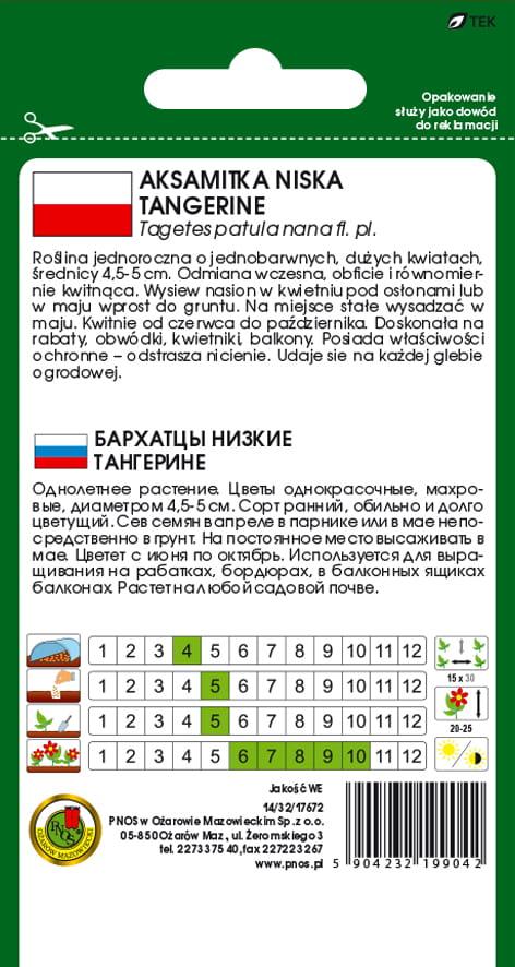 Aksamitka Pełna Niska 'Tangerine' to jednoroczna, karłowa odmiana, wyróżniająca się pełnymi, intensywnie pomarańczowymi kwiatami o średnicy 4,5-5 cm. Dzięki niewielkiej wysokości (20-25 cm) doskonale sprawdzi się na rabatach, obwódkach, balkonach, w donicach oraz jako dekoracja warzywników.