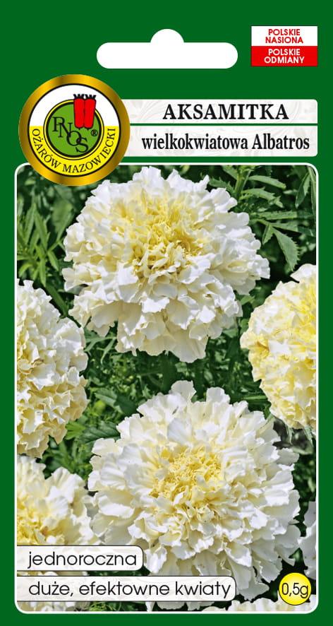 Aksamitka Wielkokwiatowa Niska 'Albatros' to jednoroczna roślina ozdobna, wyróżniająca się pełnymi, kremowobiałymi kwiatami o subtelnym, eleganckim wyglądzie. Dzięki kompaktowej wysokości (25-40 cm) jest doskonałym wyborem na rabaty, balkony oraz do obsadzeń mis i pojemników.