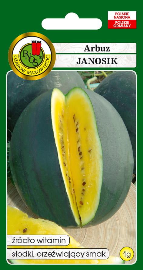 Arbuz 'Janosik' to średnio wczesna, plenna odmiana, ceniona za eliptyczno-okrągłe owoce o wadze 3,5-5,5 kg i niezwykle słodki, soczysty, żółty miąższ. Jego cienka, ciemnozielona skórka z wąskimi smugami sprawia, że jest łatwy w krojeniu, a mała ilość nasion zwiększa komfort spożycia.