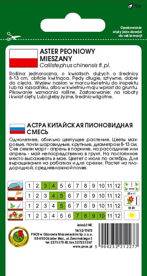 Aster Peoniowy Mieszany to jednoroczna roślina ozdobna, wyróżniająca się pełnymi, półkolistymi kwiatami o średnicy około 10 cm. Kwiaty zachwycają różnorodnością barw, co sprawia, że są doskonałą ozdobą ogrodu, rabat i kompozycji bukietowych.