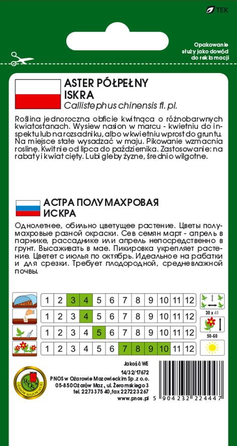 Aster Półpełny 'Iskra' Mieszany to jednoroczna roślina ozdobna, charakteryzująca się intensywnym, obfitym kwitnieniem i różnobarwnymi kwiatostanami. Dzięki wysokości 50-60 cm doskonale nadaje się na rabaty, obwódki oraz do tworzenia efektownych bukietów – kwiaty długo zachowują świeżość po ścięciu.