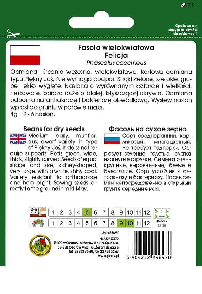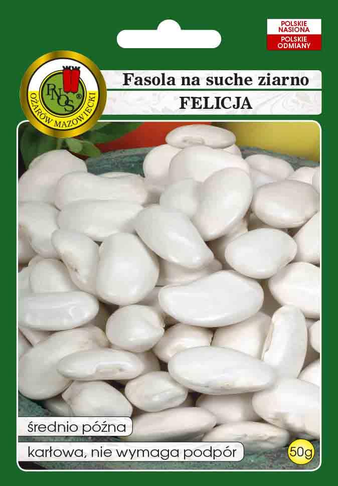Fasola Felicja to średnio wczesna odmiana, która nie wymaga podpór, co sprawia, że jest łatwa w uprawie. Roślina o dużych, zielonych, lekko wygiętych strąkach, wytwarza bardzo duże, białe nasiona o błyszczącej okrywie.