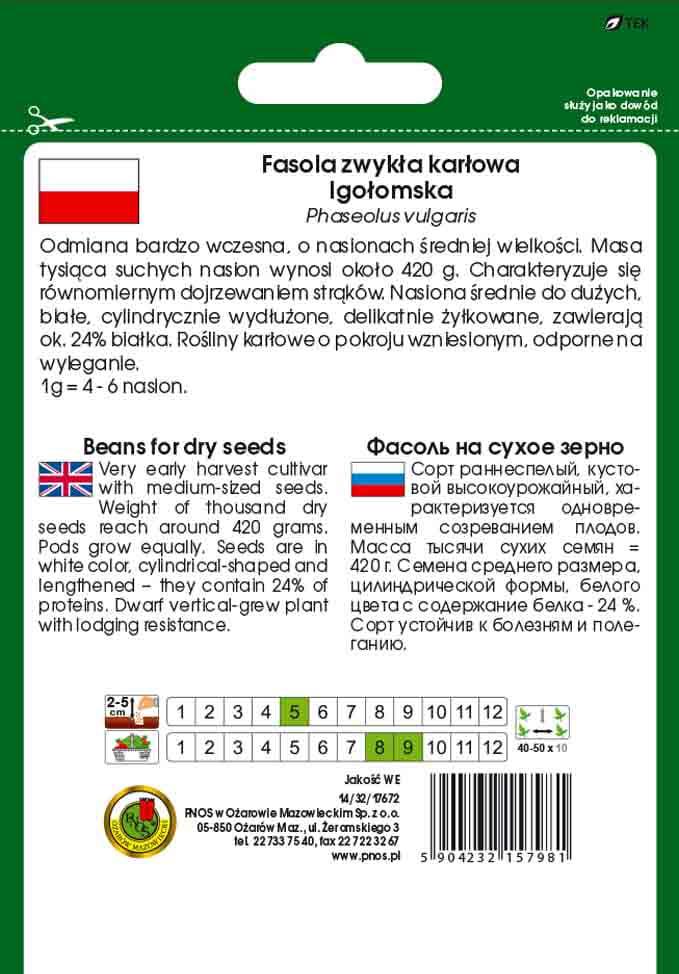 Fasola Igołomska to bardzo wczesna, karłowa odmiana przeznaczona na suche nasiona. Charakteryzuje się średnimi do dużych, białymi, cylindrycznie wydłużonymi nasionami o delikatnym żyłkowaniu. Ich wysoka zawartość białka (24%) sprawia, że są doskonałym składnikiem zdrowej diety.