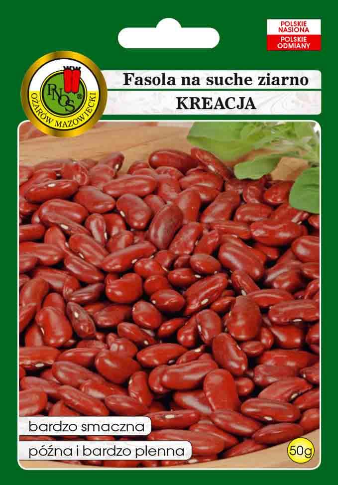 Fasola Kreacja to późna, karłowa odmiana fasoli przeznaczona na suche nasiona. Rośliny dorastają do 45-50 cm, a strąki osadzone są wewnątrz krzaka, co ułatwia zbiór. Nasiona są średniej wielkości, nerkowate, bordowe z połyskiem i zawierają aż 25% białka, co czyni je doskonałym źródłem wartości odżywczych.
