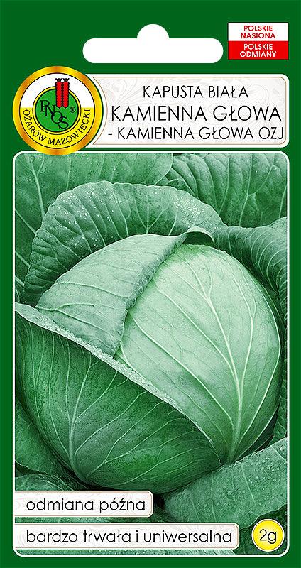 Kapusta 'Kamienna Głowa' to późna odmiana o wyjątkowo zwartej strukturze główek, ceniona w Polsce za wysoką plenność i doskonałe właściwości przechowalnicze. Tworzy duże, kuliste lub lekko spłaszczone główki, osiągające wagę od 3,5 do 4,5 kg. Liście wewnętrzne są białe, delikatne i smaczne, natomiast zewnętrzne mają intensywnie zieloną barwę. Odmiana ta ma wysoki głąb (18-25 cm) i jest odporna na pękanie.