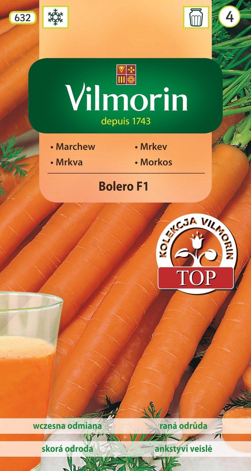 Marchew 'Bolero' F1 to wczesna, plenna odmiana typu nantejskiego, charakteryzująca się gładkimi, intensywnie wybarwionymi korzeniami o długości 18-22 cm. Dzięki wysokiej zawartości cukrów i suchej masy jest niezwykle słodka i smaczna, a przy tym nie kumuluje azotanów i metali ciężkich.