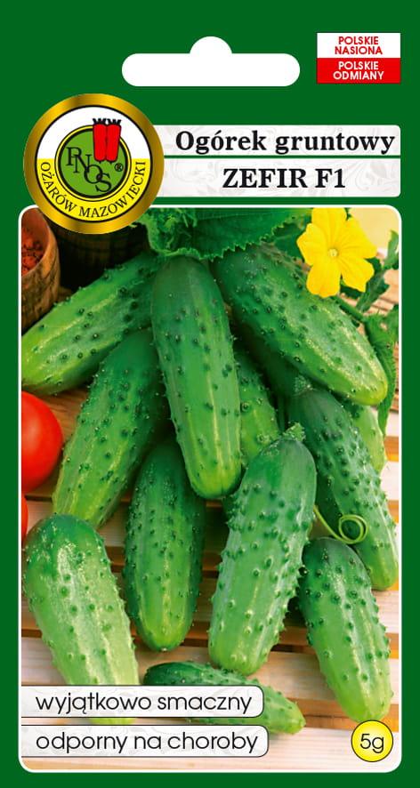 Ogórek 'Zefir' F1 to wczesna, mieszańcowa odmiana gruntowa, doskonała zarówno do spożywania na świeżo, konserwowania, jak i kiszenia. Rośliny charakteryzują się silnym wigorem, co przekłada się na wysokie plony. Owoce są bardzo kształtne, bez szyjki, z delikatnie zaznaczonymi bruzdami. Ich intensywnie zielona, błyszcząca skórka posiada jasne smugi dochodzące do połowy długości owocu.