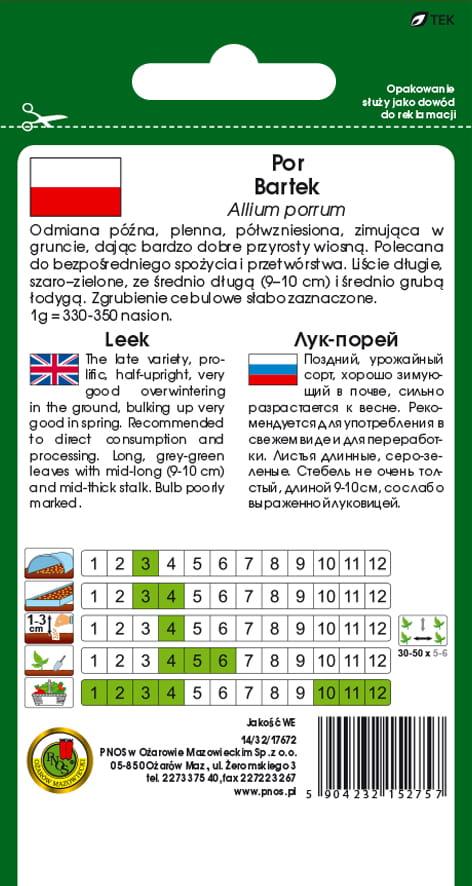Por 'Bartek' to wyjątkowo plenna odmiana późna, idealna do zbiorów jesiennych i zimowych. Tworzy półwzniesione rośliny o średnio długiej (9-10 cm) i średnio grubej łodydze rzekomej. Liście są długie, szaro-zielone, a zgrubienie cebulowe jest słabo zaznaczone, co czyni tę odmianę doskonałą do przetwórstwa i spożycia na świeżo.