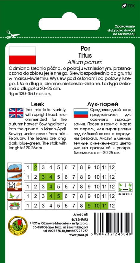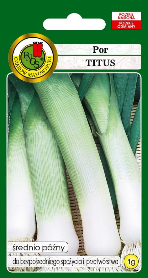 Por 'Titus' to niezawodna odmiana średnio późna, przeznaczona do zbiorów jesiennych. Rośliny charakteryzują się wzniesionym pokrojem, długimi, ciemnozielonymi liśćmi z lekkim niebieskawym odcieniem oraz łodygą rzekomą o długości 20-25 cm. Idealny do spożycia na świeżo, przetwórstwa i mrożenia.