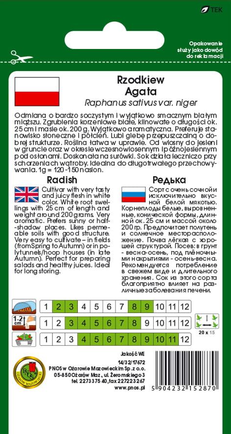 Wspaniała odmiana przeznaczona do uprawy od wiosny do jesieni w gruncie oraz w okresie wczesnowiosennym i późnojesiennym pod osłonami. Zgrubienia korzeniowe białe, klinowate o długości 20-25cm i masie ok. 200g. Wyjątkowo aromatyczne. Miąższ biały, soczysty, bardzo smaczny. Preferuje stanowiska słoneczne i półcień. Roślina łatwa w uprawie. doskonała na surówki. Sok ma działanie lecznicze przy schorzeniach wątroby. Bardzo długo utrzymuje dojrzałość konsumpcyjną nie parciejąc i nie wybijając w pędy kwiatostanowe.