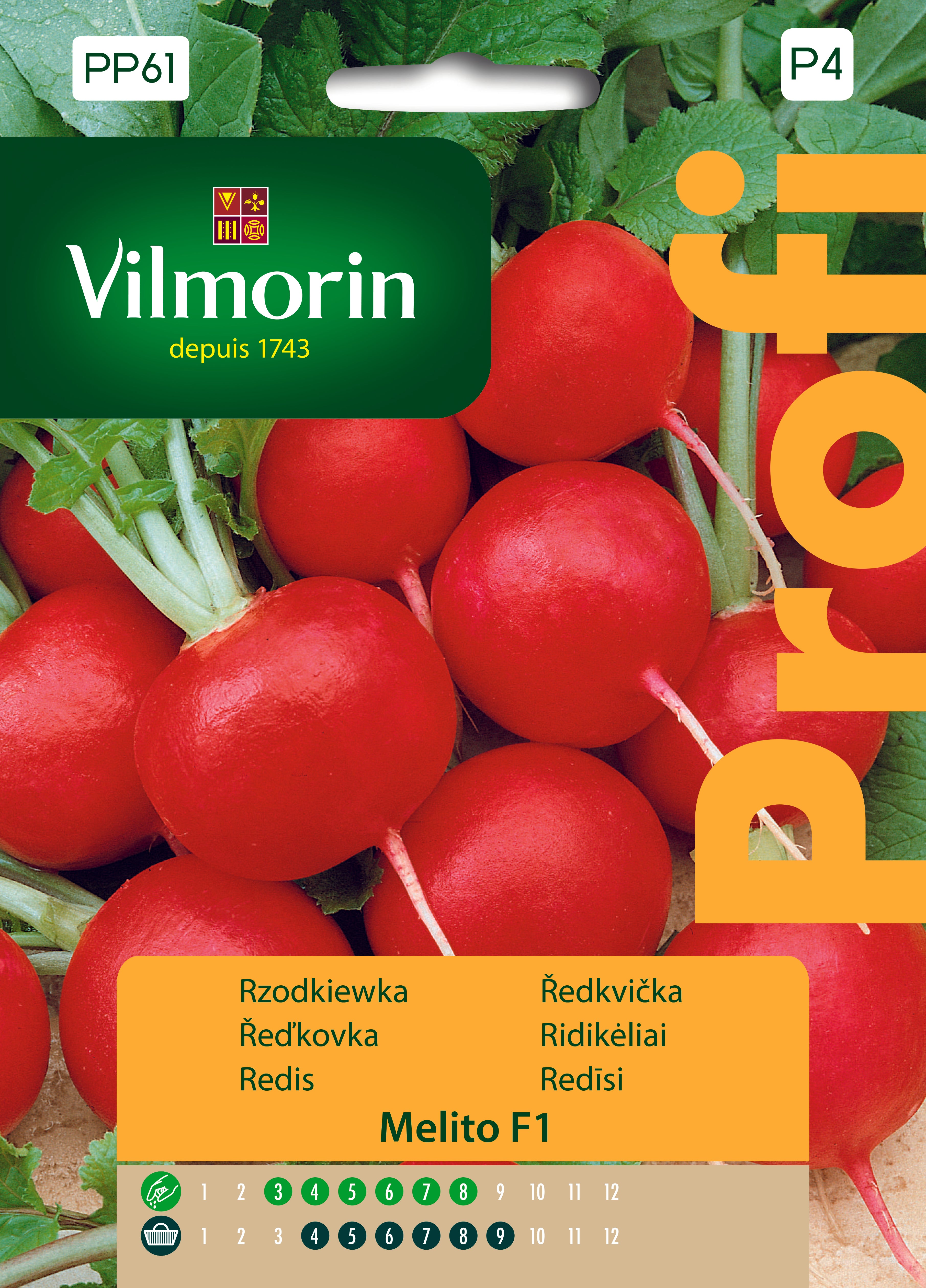 Melito F1 to rzodkiewka okrągła, czerwona, przeznaczona do uprawy w gruncie. Odmiana tworzy kuliste zgrubienia o średnicy 35–45 mm, intensywnie czerwone i odporne na pękanie, co ułatwia zbiór i ogranicza straty.