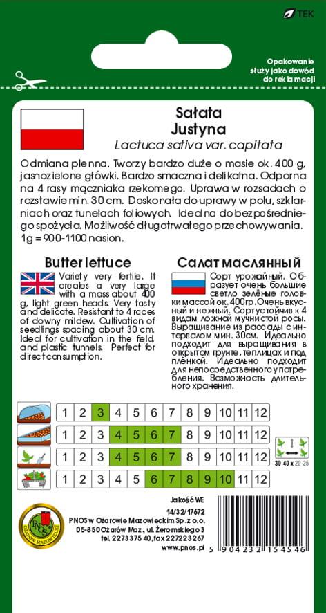 Sałata masłowa 'Justyna' to wysokowydajna odmiana, doskonała do uprawy wiosennej, letniej i jesiennej w gruncie oraz wczesnowiosennej w szklarniach i tunelach foliowych. Tworzy duże, jasnożółtozielone główki o wadze 300-400 g, które cechują się delikatnym smakiem i chrupiącą strukturą.
