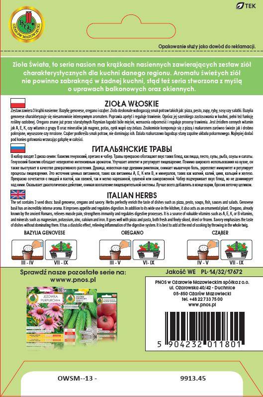 Zestaw zawiera 3 krążki nasienne: Bazylię genovese, oregano i cząber. Zioła doskonale wzbogacają smak potraw takich jak: pizza, pesto, zupy, ryby, sosy czy sałatki. Bazylia genovese charakteryzuje się niesamowicie intensywnym aromatem. Poprawia apetyt i reguluje trawienie. Oprócz jej szerokiego zastosowania w kuchni, pełni też funkcję rośliny ozdobnej. Oregano znane już przez starożytnych Rzymian łagodzi bóle mięśni, wzmacnia odporność i reguluje procesy trawienia. Jest źródłem cennych witamin jak A, E, K, czy witamin z grupy B oraz minerałów jak magnez, potas, cynk wapń czy żelazo. Znakomicie komponuje się z pizzą i makaronem zarówno świeże jak i drobno pokrojone, wysuszone czy mrożone. Cząber podkreśla smak potraw, nie dominując ich. Działa rozkurczowo łagodząc stany zapalne układu pokarmowego. Naj lepiej dodać pod koniec gotowania wrzucając gałązkę w całości.