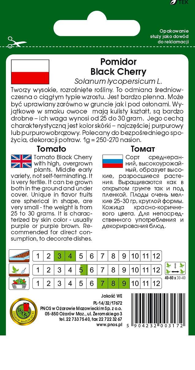 Pomidor Black Cherry to średnio wczesna odmiana koktajlowa, ceniona za bogaty smak i wysoką plenność. Rośliny osiągają duże rozmiary i mają ciągły wzrost, co oznacza, że owocują aż do pierwszych przymrozków.