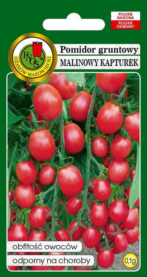 Pomidor Malinowy Kapturek to nowa, samokończąca odmiana drobnoowocowa, wyróżniająca się cylindrycznymi, różowo-malinowymi owocami o wadze 7-8 g. Dzięki niesamowitej plenności, z jednej rośliny można uzyskać nawet 450-600 owoców, tworzących długie, gęste grona o długości 45-75 cm.