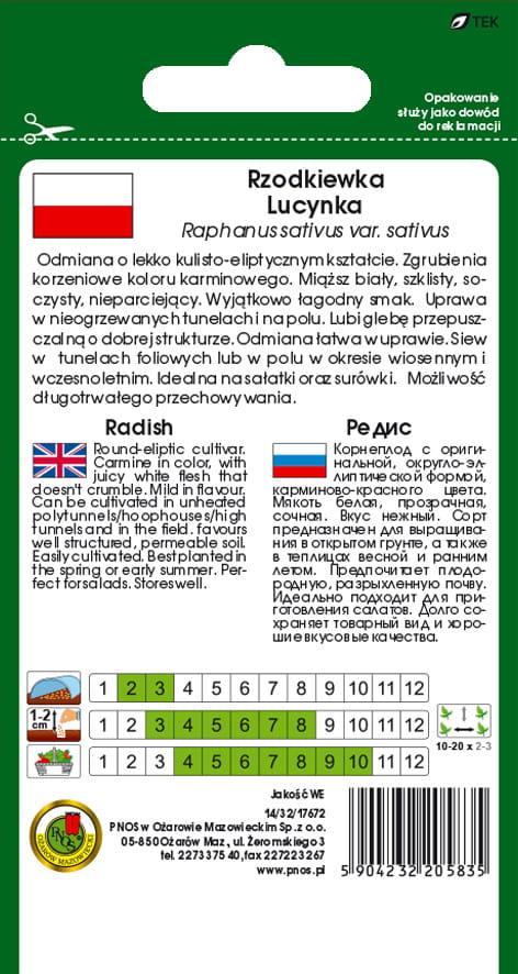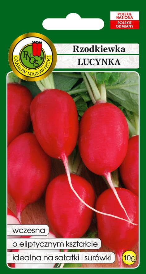 Rzodkiewka 'Lucynka' to uniwersalna odmiana, przeznaczona do uprawy w nieogrzewanych tunelach wczesną wiosną oraz w polu od wiosny do jesieni. Tworzy kulisto-eliptyczne zgrubienia korzeniowe, pokryte karminową, jednolitą na całej powierzchni skórką. Jej biały, szklisty miąższ wyróżnia się soczystością, delikatnym smakiem i brakiem tendencji do parcenia.