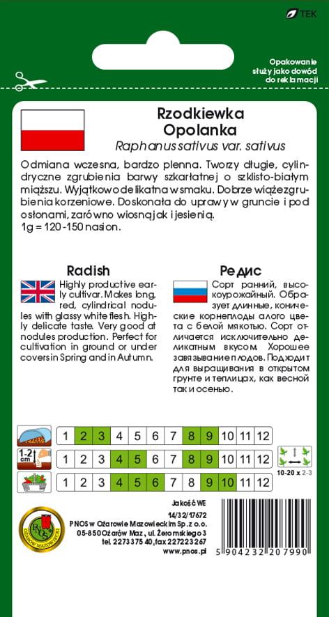 Rzodkiewka 'Opolanka' to wczesna i bardzo plenna odmiana, przeznaczona do uprawy w gruncie oraz pod osłonami, zarówno wiosną, jak i jesienią. Tworzy długie, cylindryczne zgrubienia o intensywnie szkarłatnej barwie i szklisto-białym, chrupiącym miąższu. Odmiana ta wyróżnia się doskonałą zdolnością wiązania zgrubień korzeniowych, co przekłada się na stabilne i wysokie plony.